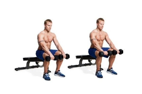 - Bước 1: ngồi lên ghế, thẳng lưng, mỗi tay cầm 1 tạ đơn. Đặt tay lên đầu gối. Lòng bàn tay hướng xuống