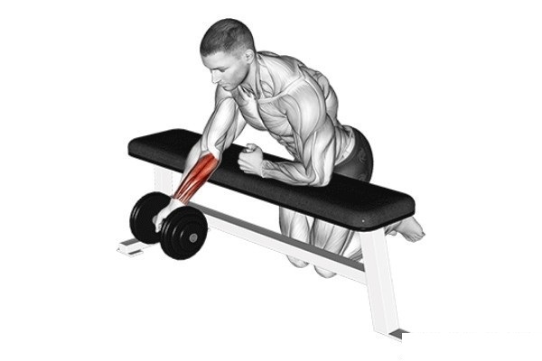 - Bước 1: Giữ một quả tạ trên tay phải, quỳ bên cạnh một băng ghế phẳng. Tay trái chống lên ghế. Lòng bàn tay phải hướng lên. Một phần cẳng tay phải ở ngoài ghế.