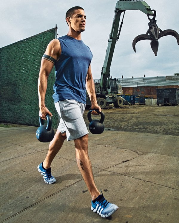 Cách tập đơn giản, bạn chỉ cần xách tạ đơn, mỗi tay 1 tạ, với mức tạ phù hợp và bắt đầu bước đi vòng quanh là được.