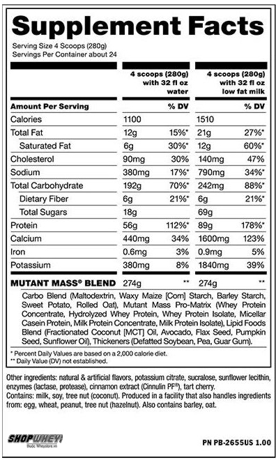 Từ năm 2005 sữa tăng cân Mutant Mass đã vượt ra khỏi hardcore. Hiểu một cách đơn giản, mỗi liều dùng nạp vào 1100 calo, 56g protein, và sự kết hợp của nguồn tinh bột phức (với ngô nếp) và chất béo MCT. Tất cả điều đó kết hợp với chế độ ăn bình thường của bạn, sẽ giúp bạn tăng cân. Mutant Mass cũng chứa Glutamine, Cinnulin PF® với chiết suất từ quế, bột hạt lanh và sữa non rất tốt cho cơ thể.